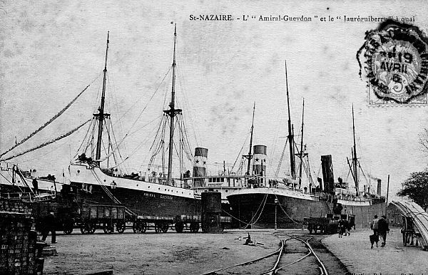 L'amiral Gueydon est à gauche, caractérisé par les deux étoiles rouge sur le bandeau blanc de sa cheminée (le corps principal de la cheminée étant entièrement rouge) , signe distinctif de la Compagnie des Chargeurs Réunis