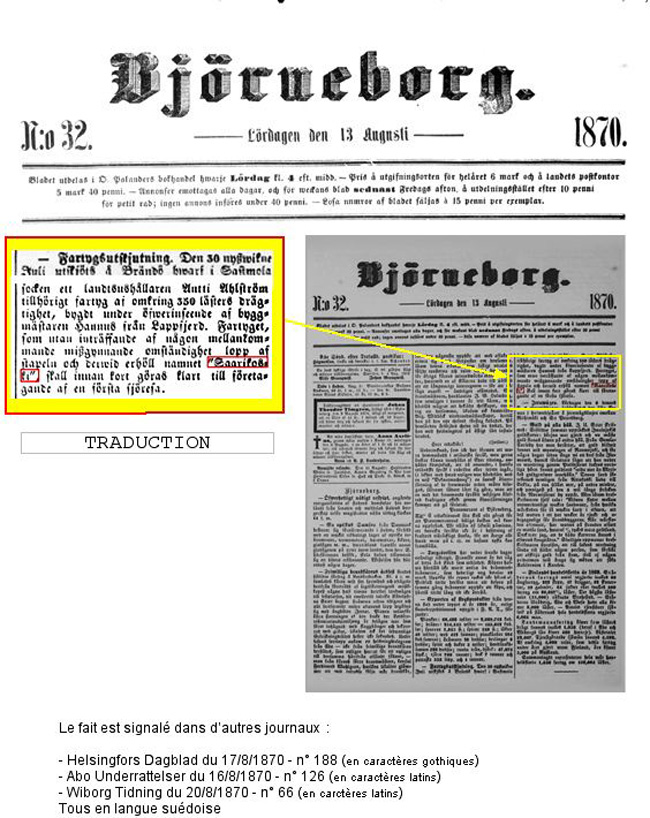 - Au petit matin du 30 juillet, sorti du chantier naval de constrcution de Brändö, situé dans la commune de Sastmola, un voilier ayant une jauge d'environ 700 tonnes. Celui-ci appartient à Annti Alshström, un exploitant agricole, a été construit sous la direction de l'entrepreneur Hannus de Lappfjerd (Lappfjärd aujourd'hui). Le bateau a été mis à l'eau, sans qu'il y ait eu le moindre incident. Il a alors reçu le nom de "Saarikoski", ceci même avant d'être fin prêt pour se préparer à faire son premier voyage en mer.