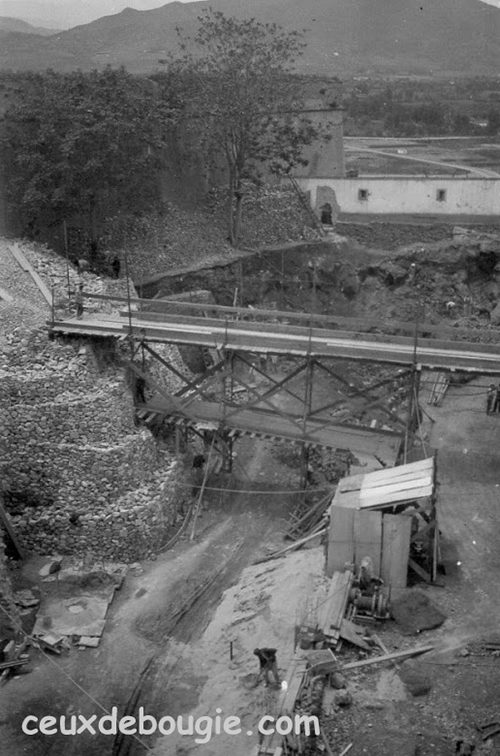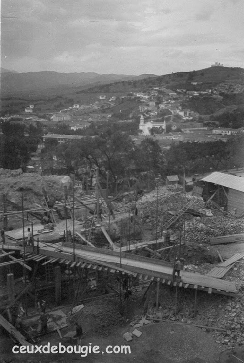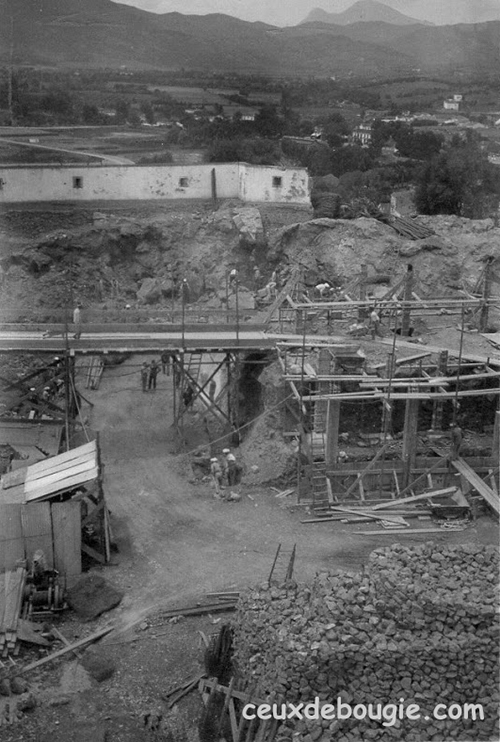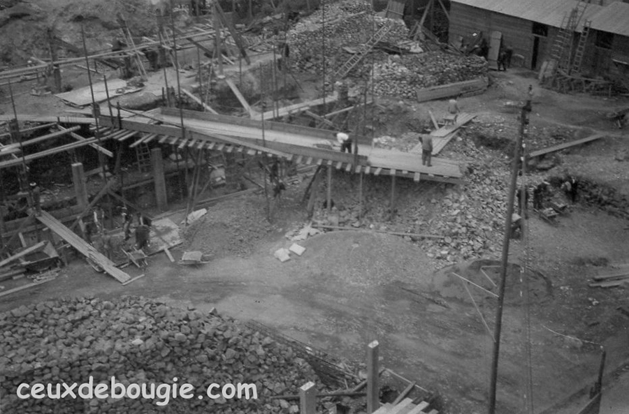 | Montage des poteaux du plancher haut du Marché | |