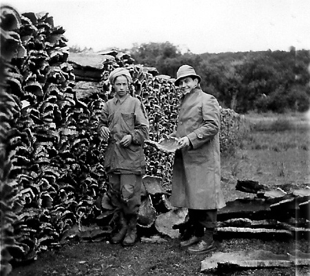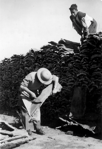 C'est de cet arbre que provient la matière première. Après sa plantation, il faut attendre vingt-cinq années pour qu'il devienne exploitable. Sa première écorce appelée “liège mâle” (ou vierge) boursouflée, crevassée, de couleur claire se forme avec parfois des traces de mousse. On commence à ôter cette écorce (on disait démascler) qui est impropre à la bouchonnerie. Une nouvelle écorce se formera et au bout de dix années, elle aura un aspect presque lisse mais légèrement croûteux et de couleur sombre. On la nommera “liège de reproduction” (ou liège femelle) On démasclera l'arbre au moment de la montée de sève. Cette écorce sera acheminée vers un dépôt où elle sera empilée pour être mise à la vente (un de ces dépôts se trouvait sous la surveillance des Eaux et Forêts sur les terre-pleins, à proximité de la saboteuse des Chemins de Fer). Ces piles de liège seront identifiées par une pancarte indiquant le nom de la forêt, leurs poids et un numéro d'ordre. Les lièges mis à la vente étaient en majorité propriété de l'Administration des Domaines. Il appartenait aux futurs acquéreurs de visiter les dépôts et d'estimer la valeur de toutes les piles. Nous appelions cette opération les “sondages”. Nous prélevions dans chaque pile une petite quantité de liège et en faisions un classement à terre suivant leur épaisseur, ce qui permettait d'en établir un pourcentage. Par ailleurs nous examinions de long en large tous les bords de la pile pour avoir une opinion sur les défauts qui pouvaient apparaître : inclusion terreuse (grain rouge), soufflures (poches d'air) et taches jaunes (pourriture). Tous ces renseignements étaient consignés sur des fiches que consultait notre Direction, au moment des enchères car les prix se cotaient en fonction de ces critères.